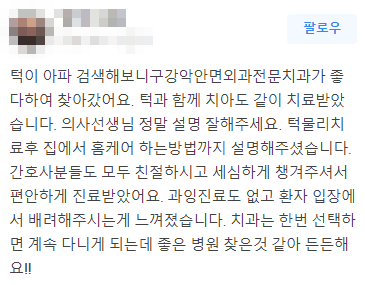턱관절 진료받으시던 기억이 나네요^^ 편안하고 만족스러우셨다니 다행이에요! 저희 치과와 함께 빠르게 턱관절 질환 불편감이 사라지시면 좋겠습니다. :D