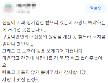 사랑니 불편감에서 벗어나셔서 다행이네요~! 완전히 아물때까지 주의사항 잘 지켜주시구요~ 즐거운 하루되세요!