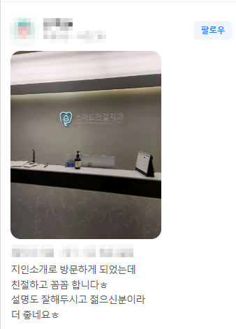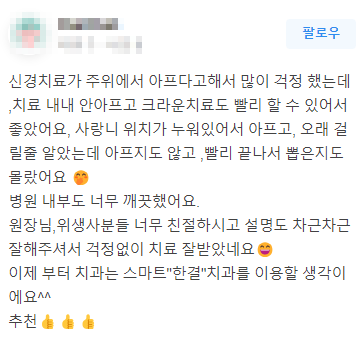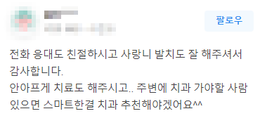 진료에 만족하셨다니 다행이네요~! 치료받은 치아들도 오랫동안 편안히 잘 쓰시면 좋겠습니다 :) 오늘도 좋은하루되세요~☺️