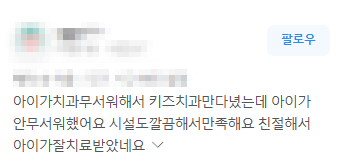 자녀분이 잘 치료받고 가셔서 다행이에요 : ) 앞으로도 자녀분 깨끗한 치아건강 지켜주기위해 노력하겠습니다. 감사합니다 !
